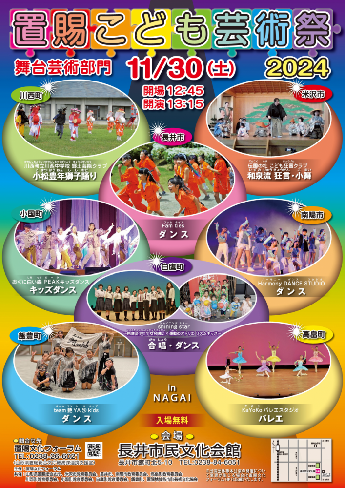 置賜総合支庁、置賜3市5町の文化行政担当部局、各市町の芸術文化協会などで組織する置賜文化フォーラムでは、置賜地域の文化活動に取り組む子どもたちの発表の場の提供と、次代の置賜地域の文化を担う人材を育成することを目的に、毎年「置賜こども芸術祭」を開催しています。今年は、長井市民文化会館を会場に、置賜各地で文化活動に取り組んでいるこどもたちが集まり、日ごろの練習の成果を披露します。今年も、昨年度に引き続き、置賜3市5町から8団体が参加します。舞台上でのこどもたちの一生懸命な姿をぜひ、ご覧ください!<日時>令和6年11月30日(土)開場12:45 開演13:15<場所>長井市民文化会館(長井市館町北5−10)<出演団体>【米沢市】伝国の杜こども狂言クラブ【長井市】Fam ties【南陽市】Harmony DANCE STUDIO【高畠町】KaYoKoバレエスタジオ【川西町】川西町立川西中学校郷土芸能クラブ【小国町】おぐに白い森PEAKキッズダンス【白鷹町】shining star〜白鷹町少年少女合唱団×運動のアトリエ リズムキッズ〜【飯豊町】team 艶YA 沙 kids<入場料>無料<問い合わせ>置賜文化フォーラム事務局 TEL:0238-26-6021詳細はチラシをご覧ください。