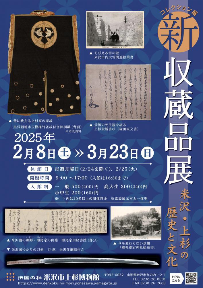 2025年2月8日(土)よりはじまるコレクション展のお知らせです。コレクション展「新収蔵品展 米沢・上杉の歴史と文化」 当館では、米沢・上杉家にゆかりある資料や、置賜地域の郷土作家の美術作品などの収集に努めており、過去10年で収集した資料数は、11,000点以上に及びます。しかし、これまでの展示で紹介できたものは、そのごく一部に過ぎません。 そこで、本展では平成30年(2018)以降に寄贈・寄託された歴史資料を中心に、米沢・上杉の歴史と文化にまつわる多彩な資料を展示します。 上杉家ゆかりの文化財をはじめ、米沢藩の刀剣とその管理がうかがえる古文書、幕末の志士雲井龍雄が家族に送った手紙、米沢の景観を捉えた絵はがきなど、展示資料は全て初公開の資料です。米沢・上杉の新たな歴史の一面をお楽しみください。 【会期】2025年2月8日(土)〜2025年3月23日(日) 【休館日】毎週月曜日(祝日の場合は翌日) 【開館時間】9:00〜17:00(チケット販売は16:30まで) 【入館料】一般500円(400円)/高大生300円(240円)/小中生200円(160円) ※( )は20名以上の団体料金 【ギャラリートーク】展示解説 ※申し込み不要 日 時 : 2月8日(土)、3月15日(土) 14:00〜 会 場 : 米沢市上杉博物館 企画展示室 定 員 : なし 参 加 費 : 企画展入館料 担当学芸員 : 池野 理 ※お申し込み、お問い合わせは TEL:0238-26-8001 へお願い致します。 コレクション展の主な展示資料等、詳しくは当館ホームページをご覧ください。 皆様のご来館を心よりお待ちしております! 【お問い合わせ】 米沢市上杉博物館 0238-26-8001