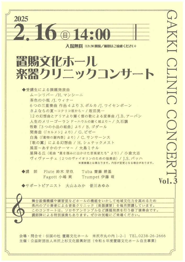 ▼【「置賜文化ホール楽器クリニックコンサート」開催のお知らせ】