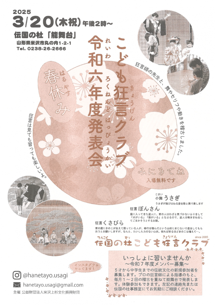 伝国の杜置賜文化ホールにて、「伝国の杜こども狂言クラブ令和六年度発表会」が開催されます。伝国の杜こども狂言クラブでは、5歳から中学生までの子どもを対象に狂言師の指導のもと、狂言・能の稽古会を開催しています。今回は、昨春より稽古を重ねた「小舞」と「狂言」が披露されます。この機会にぜひ、ご来場ください。<日時>令和7年3月20日(祝・木)14:00開演<場所>伝国の杜置賜文化ホール エントランス能舞台<入場料>無料<お問い合わせ>伝国の杜置賜文化ホール 0238−26−2666詳細は、チラシをご覧ください。