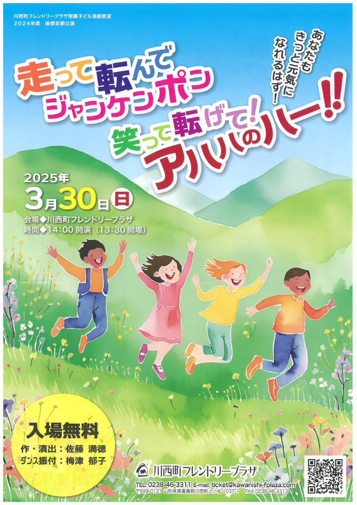 川西町フレンドリープラザにて「子ども演劇教室後期定期公演」が開催されます!タイトルは、「走って転んでジャンケンポン 笑って転げて!アハハのハー!!」。演劇教室のこどもたちが走って笑って元気に演じます。皆さまのご来場お待ちしております。<日時>令和7年3月30日(日)14:00開演(13:30開場)<場所>川西町フレンドリープラザ<料金>無料<お問い合わせ>川西町フレンドリープラザ 0238−46−3311詳細はチラシをご覧ください。
