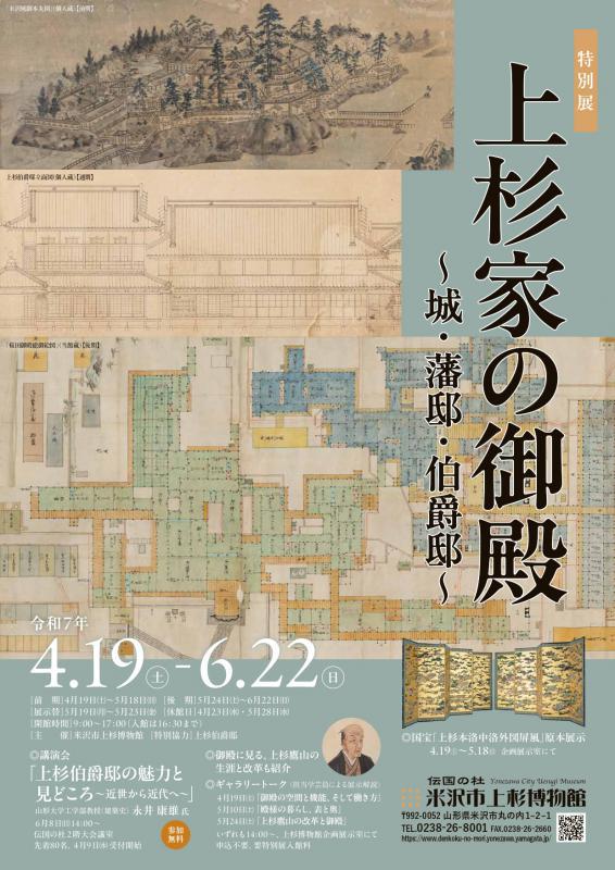 4月19日(土)よりはじまる特別展のお知らせです。特別展「上杉家の御殿 〜城・藩邸・伯爵邸〜」 江戸時代、米沢城の本丸御殿は、上杉家当主の生活と儀礼の場であり、藩政の中枢としても機能しました。また、二の丸と三の丸には上杉家一族が住む複数の屋敷がありました。江戸には桜田の上屋敷をはじめ、麻布の中屋敷、白金の下屋敷があり、これらの屋敷には上杉家の人々を警固し、暮らしを助け、藩政を担う多数の藩士や奥勤めの女性が働いていました。 米沢城は大判の城絵図が、江戸藩邸は精緻かつ美麗な平面図が、「上杉文書」(当館蔵)を中心に数多く伝来し、その変遷を知ることができます。本展示では特に第9代藩主上杉鷹山在世中の絵図を通して、鷹山がいつ、どの場所で、どのような生涯を送り、藩政改革に取り組んだのかをご紹介します。また、国宝「上杉家文書」や儀式の手引書などを読み解きながら、表と奥に代表される御殿の空間構成と部屋ごとの機能、上杉家の人々の暮らしと儀礼、そして藩士の職制や仕事ぶりを探ります。 さらに、当館の西隣には上杉伯爵邸(国登録有形文化財)が現存し、今年は大正14年(1915)の再建から100年にあたります。これを記念し、上杉伯爵邸の特徴と見どころなどを紹介します。 【会期】前期:4月19日(土)〜5月18日(日) 後期:5月24日(土)〜6月22日(日) ※展示替え:5月19日(月)〜5月23日(金) 【休館日】4月23日(水)、5月28日(水) 【開館時間】9:00〜17:00(チケット販売は16:30まで) 【入館料】一般800円(640円)/高大生500円(400円)/小中生300円(240円) ※( )は20名以上の団体料金 ※常設展とのセットのみ販売 ♦入館料無料の日 5月5日(月・祝) こどもの日 小中高生無料! 5月18日(日) 国際博物館の日 どなたでも無料! 【ギャラリートーク】展示解説 ※申し込み不要 日 時 : 前期 4月19日(土) 御殿の空間と機能、そして働き方 5月10日(土) 殿様の暮らし、表と奥 後期 5月24日(土) 上杉鷹山の改革と御殿 ※いずれも14:00開始 会 場 : 米沢市上杉博物館 企画展示室 定 員 : なし 参 加 費 : 特別展入館料 担当学芸員 : 佐藤 正三郎 【講演会】 ※事前申込制 4月9日(水)9:00から受付開始「上杉伯爵邸の魅力と見どころ〜近世から近代へ〜」 日 時 : 6月8日(日)14:00〜16:00 会 場 : 伝国の杜 2階大会議室 定 員 : 80名 参 加 費 : 無料 講 師 : 山形大学工学部教授(建築史) 永井 康雄 氏※お申し込みは TEL:0238-26-8001 へお願い致します。 特別展の主な展示資料等、詳しくは当館ホームページをご覧ください。 皆様のご来館を心よりお待ちしております! 【お問い合わせ】 米沢市上杉博物館 0238-26-8001
