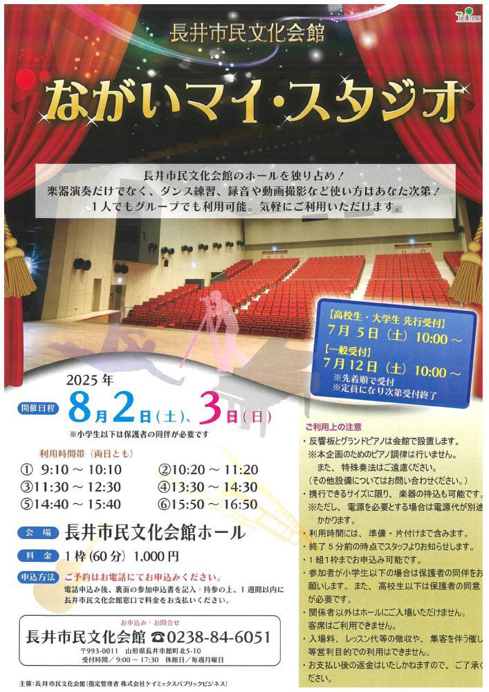 長井市民文化会館にて、「ながいマイ・スタジオ」が開催されます。1枠1時間単位で気軽に、長井市民文化会館のホールがご利用いただけます。<日時>令和7年8月2日(土)、3日(日)(詳細な時間は画像をご覧ください。)<会場>長井市民文化会館<料金>1枠(1時間)1,000円<問い合わせ>長井市民文化会館 0238-84-6051詳細は、チラシをご覧ください。