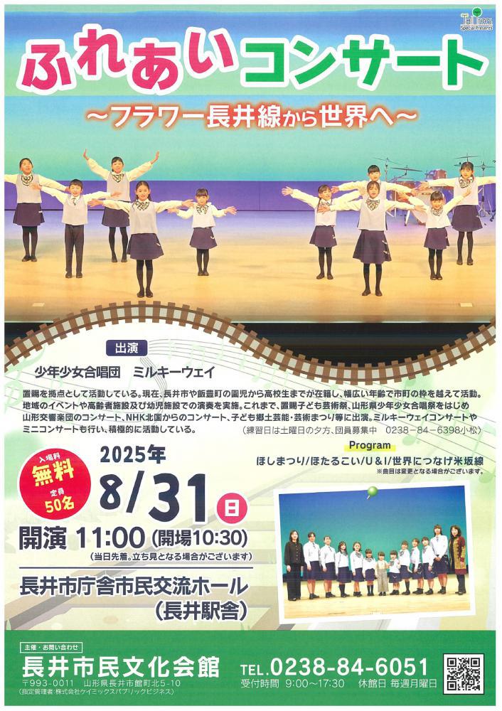 長井市庁舎市民交流ホール(長井駅舎)にて、ふれあいコンサートが開催されます。置賜を拠点として活動している「少年少女合唱団ミルキーウェイ」が、フラワー長井線から世界へと題し、様々な合唱曲を披露します。ぜひ、ご来場ください。<日時>令和7年8月31日(日)開演11:00(開場:10:30)<場所>長井市庁舎市民交流ホール<料金>無料(定員50名)<問い合わせ>長井市民文化会館 Tel 0238-84-6051詳細は、チラシをご覧ください。