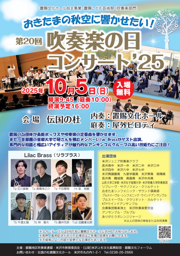伝国の杜置賜文化ホールにて、第20回吹奏楽の日コンサートが開催されます。ホール内の内奏だけでなく、屋外ピロティでの庭奏も行われ、大小さまざまな編成のバンドが次々に登場します。ぜひ、ご来場ください。<開催日時>令和7年10月5日(日)9:45開演(庭奏10:00) 16:00終演<場所>伝国の杜置賜文化ホール<料金>無料<お問い合わせ先>伝国の杜置賜文化ホール(0238-26-2666)詳細はコチラ