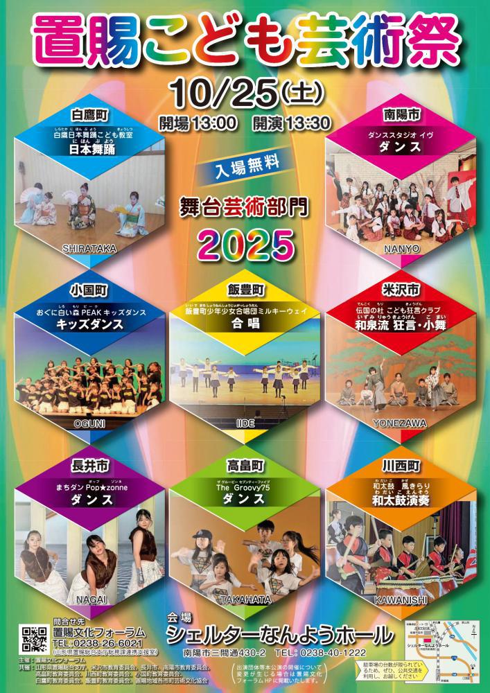 置賜総合支庁、置賜3市5町の文化行政担当部局、各市町の芸術文化協会などで組織する置賜文化フォーラムでは、置賜地域の文化活動に取り組むこどもたちの発表の場の提供と、次代の置賜地域の文化を担う人材を育成することを目的に、毎年「置賜こども芸術祭」を開催しています。今年は、シェルターなんようホールを会場に、置賜各地で文化活動に取り組んでいるこどもたちが集まり、日ごろの練習の成果を披露します。今年も、昨年度に引き続き、置賜3市5町から8団体が参加します。舞台上でのこどもたちの一生懸命な姿をぜひ、ご覧ください!<日時>令和7年10月25日(土)開場13:00 開演13:30<場所>シェルターなんようホール(南陽市三間通430-2)<出演団体>【米沢市】伝国の杜こども狂言クラブ【長井市】まちダンPop★zonne【南陽市】ダンススタジオイヴ【高畠町】The Groovy 75【川西町】和太鼓 風きらり【小国町】おぐに白い森PEAKキッズダンス【白鷹町】白鷹日本舞踊こども教室【飯豊町】飯豊町少年少女合唱団ミルキーウェイ<入場料>無料<問い合わせ>置賜文化フォーラム事務局 TEL:0238-26-6021詳細はチラシをご覧ください。