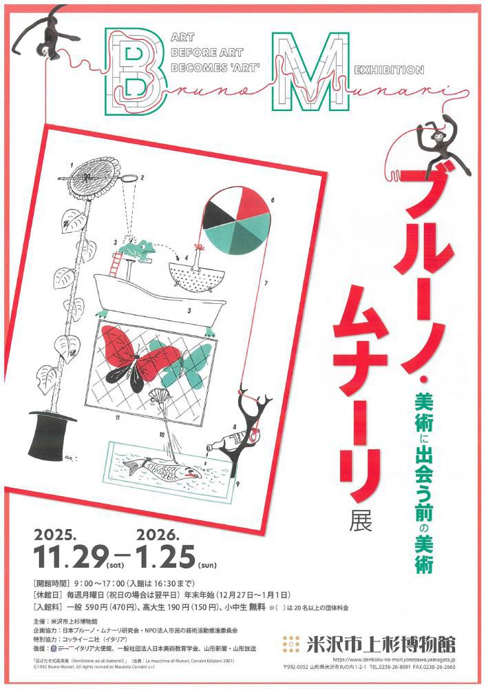 米沢市上杉博物館にて、「ブルーノ・ムナーリ展」が開催されます。敷居が高い、よくわからないと思われがちな「美術」。ブルーノ・ムナーリは、そんな「美術」の垣根を取り払い、日常の中にある形や色、デザインの面白さや美しさに気づかせてくれるイタリアのアーティストです。本展は、約300点の作品や資料を通じ、視覚的な要素による伝達力や日常の中にあるアートの種をかたちにする楽しさを実感してもらう展覧会です。ぜひ、ご来場ください。 <開催日時>令和7年11月29日(土)〜令和8年1月25日(日)開館時間:9:00〜17:00(入館は16:30まで)※毎週月曜日は休館 <場所>米沢市上杉博物館(米沢市丸の内1−2−1) <入館料>一般590円高大生190円小中生無料 <問い合わせ>米沢市上杉博物館 TEL:0238-26-8001 詳細はチラシをご覧ください。