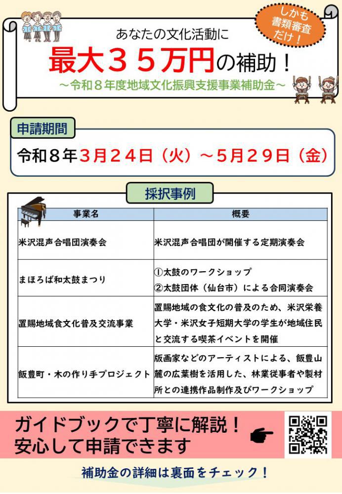 置賜文化フォーラムでは、置賜地域の皆さまが企画・運営する文化芸術事業を支援する「地域文化振興支援事業」を実施しています。このたび、令和8年度事業の募集を行いますのでお知らせします。■支援内容置賜地域で行う公演、展示、コンクール、ワークショップといった来場者を会場に集めて開催する事業に対し、置賜文化フォーラムが補助金を交付します。■申請期間令和8年3月24日(火)〜5月29日(金)・実施要綱、申請ガイドブックの内容をご確認のうえ、申請書を作成し、置賜文化フォーラム事務局に提出してください。■各資料・実施要綱・申請書等様式・チラシ・申請ガイドブック■お問合せ・申請先置賜文化フォーラム事務局(置賜総合支庁総務課連携支援室)住所:〒992-0012 米沢市金池7丁目1番50号電話:0238-26-6021 FAX:0238-26-6022メール:yokitamarenkei@pref.yamagata.jp