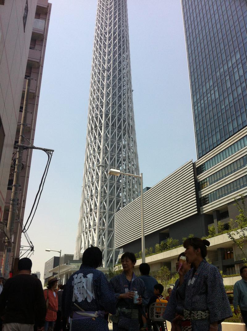 ・まずはオープン直前のスカイツリー見学。 →高い!真下からは上が見えません。