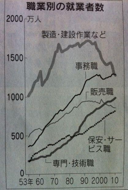グラフ(写真)でもわかるように、製造・建設作業に従事する方や販売職が減少傾向にある一方、事務職、保安・サービス職、専門・技術職が増加しています。