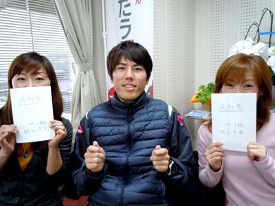 今日の 「ひるらじ」 、奈美さんと千春さんと長井市教育委員会 生涯スポーツ課の佐藤さんです。 写真、小さくてわかり難いのですが、奈美さんと千春さんの手には、『通知票』が・・・・・、中身は内緒です。佐藤さんの手には、エア通知票(笑)今日もありがとうございました。 さてさて、明日のメッセージテーマは 『今年中にやっておきたい事』 です。今年、やり残した事ややってから新年を迎えたいことは何ですか?ぜひ、「おらんだラジオ」 にも教えてくださいね♪ ●メッセージ・リクエストはこちらからですよぉ〜 『今年中にやっておきたい事』は〜、やっぱり大掃除と年賀状だなっ(+_+) (((((● エフエム い〜じゃん おらんだラジオ 77.7MHz ●)))))