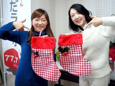 「ひるらじ」 パーソナリティの奈美さんと幸子さん♪おっきな靴下は、奈美さんの私物です(*^_^*)サンタさんにいっぱいプレゼント入れてもらってくださいね〜! 今日のメッセージテーマは 『クリスマスの思い出』 。ほのぼのするもの、しみじみするもの、フフフと笑っちゃうもの、皆さまのさまざまな思い出を聞かせていただき、ありがとうございました。 さて、明日は天皇誕生日と言うことで 『誕生日の話』 についてのメッセージ、お待ちしております! ご自身が生まれた時のこと、子供が生まれた時のエピソード、誕生日にプレゼントをもらえなかった話など、なんでも結構です! 皆さまのメッセージをお待ちしております。 ●メッセージ・リクエストはこちらから +++++ エフエム い〜じゃん おらんだラジオ 77.7MHz +++++