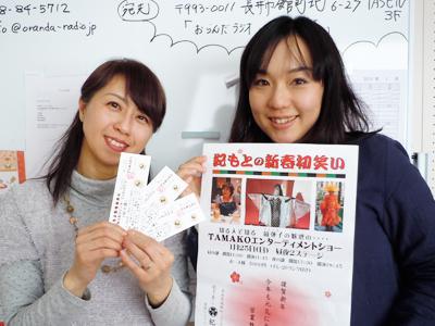 水曜日の 「けさらじ」 、千香子さんと良子さん!お二人ともファンが多くて、朝からたくさんのメッセージを頂きました♪ありがとうございます。 今日の おらだんらラジオ のメッセージテーマは 『我が家の決まり事』 です。皆さまのお家では、決まり事がありますか? 今日いただいた投稿では、「ゴミだしはパパの仕事」「食事の時は、テレビを消す」「夫婦喧嘩の次の日は、大きな声で挨拶する」などなど、さまざまなルールを教えていただきました〜♪ ちょっとしたことだけど、生活しているとなんとなくルールができますよね。仲良し家族にかかせない、ちょっとした我が家の決まり事、ぜひ教えてください! ●メッセージ・リクエストはこちら 「ひるらじ」 「ゆうらじ」 でも、同じテーマでメッセージを募集しております。お昼休みやお仕事の合間などにで結構ですので、お気軽に投稿くださいね♪ さてさて、おらんだラジオのリスナーさまにプレゼントのお知らせです!! 『割烹寿司 紀もと』 さんで開催される TAMAKOエンターテイメントショー のチケットを3名さまにプレゼント! 楽しいショーとおいしいお寿司で、楽しいひと時を過ごしてみませんか? ■知る人ぞ知る 菌弾子(きんたまこ)の魅惑の・・・・TAMAKOエンターチメントショー 日時 : 2015年1月25日(日) 昼の部 開場11:00 開演11:45 すし・2ドリンク付き 場所 : 長井市高野町二丁目九の一 割烹寿し 紀もと お問合せ先 : 割烹寿し 紀もと (TEL:84-1551) 締め切り: 2015年1月23日 ひるらじ 放送終了まで ご希望の方は、メール又はメッセージ投稿フォームより、ご応募ください。必ず、「チケット希望」と「連絡先(メールや電話番号)」をご記入ください。なお、おらんだラジオまでチケットを取りに来ていただける方を優先させていただきます。 ::::: エフエム い〜じゃん おらんだラジオ インターネットでも聴けます! :::::