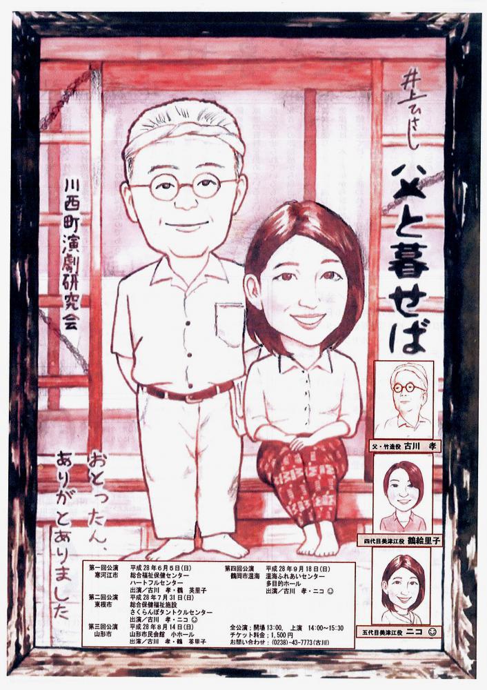 川西町出身の作家 井上ひさし原作の舞台 『父と暮らせば』のチケット (1,500円) をペアで5組さまにプレゼントいたします。 原爆投下後の広島を舞台とした二人芝居で、おらんだラジオのじっちゃパーソナリティ、古川孝さんが主演を務めます。 何度も舞台化され、映画にもなった名作です。この機会にぜひご覧ください。 ■■■ 井上ひさし原作の舞台 『父と暮らせば』 ペアチケット ■■■ 第一回公演 平成28年6月5日(日) 寒河江市 総合福祉センター ハートフルセンター 第二回公演 平成28年7月31日(日) 東根市 総合保健施設 さくらんぼタントクルセンター 第三回公演 平成28年8月14日(日) 山形市 山形市民会館 小ホール 第四回公演 平成28年9月18日(日) 鶴岡市温海 温海ふれあいセンター 多目的ホール 全公演 開場 13:00 上演 14:00〜15:30 ※全公演共通のチケットになります <応募方法> おらんだラジオホームページのメッセージフォームまたはメールで 以下の内容をご記入の上、ご応募ください。 「父と暮らせば 」チケット希望 ラジオネーム : お名前 : 連絡の取れるメールアドレスまたは、電話番号 : <応募条件> ・募集締め切り 2016年5月25日(水)ゆうらじ 終了まで ・おらんだラジオまで直接チケットを取りにきていただける方に限ります ※応募多数の場合には抽選となります ※当選者には、おらんだラジオ事務局よりご連絡致します ::::: エフエム い〜じゃん おらんだラジオ 77.7MHz :::::