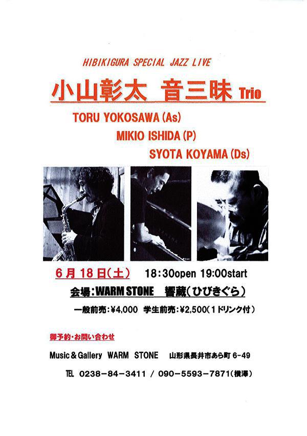 T's Music Lounge の横澤徹さんの参加する JAZZ LIVE。横澤さんより、おらんだラジオのリスナーさんペアで1組(一般前売り 4,000円×2枚)ご招待いただきました! 登録有形文化財に認定された WARM STONE 響蔵(ひびきぐら)で、大人のJAZZをお楽しみください。 ■■■ 「小山彰太 音三昧 Trio JAZZ LIVE」 ペアで1組ご招待! ■■■ ●小山彰太 音三昧 Trio JAZZ LIVE 日 時 : 2016年6月18日(土) 18:30 open 19:00 start 場 所 : WARM STONE 響蔵(ひびきぐら) 長井市あら町6-49 一般前売 4,000円 学生前売:2,500円(1ドリンク付)<応募方法> おらんだラジオホームページのメッセージフォームまたはメールで以下の内容をご記入の上、 ご応募ください。 ※※ プレゼントの応募は締め切りました。たくさんのご応募ありがとうございました。 ※※ ●小山彰太 音三昧 Trio JAZZ LIVE ペア1組 ご招待 ラジオネーム : お名前 : 連絡の取れるメールアドレスまたは、電話番号 : <応募条件> ・募集締め切り 2016年6月13日(月)ゆうらじ 終了まで ※応募多数の場合には抽選となります ※当選者には、おらんだラジオ事務局よりご連絡致します ::::: エフエム い〜じゃん おらんだラジオ 77.7MHz :::::