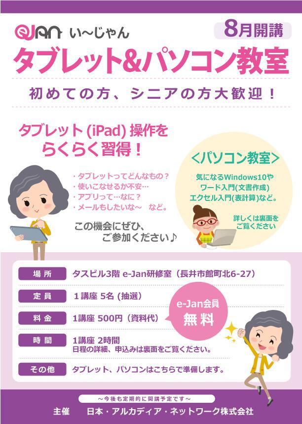 ▼【ご案内】e-Janタブレット教室&パソコン教室 8開講のお知らせ