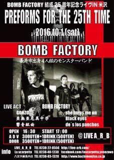 メンバー全員が 長井出身の ハードコアバンド BOMB FACTORY の結成25周年記念ライブのチケットを 5名にプレゼント。 一人1枚限り、先着順にプレゼントいたします。ご希望の方は、おらんだラジオのスタジオまで取りに来てください。なくなり次第終了となります。(すぐに取りに来れない場合にはご連絡ください) ■■■ 「BOMB FACTORY 結成25周年記念ライブin米沢」のチケットを先着5名に ■■■ ●BOMB FACTORY 結成25周年記念ライブin米沢 『PREFORMS FOR THE 25TH TIME』 日時 : 2016年10月1日(土) 開場 16:30 開演 17:00 場所 : LIVE A_R_B (米沢市門東町3-2-51 ) Ticket¥(1DRINK別¥500) 前売¥3,000 当日¥3,500 ※※ プレゼントは終了しました。たくさんのご応募ありがとうございました。 ※※<応募方法> 希望者に先着順にプレゼントいたします。 おらんだラジオのスタジオまで取りに来てください。 (夜は7時過ぎまで、土日はお休みとなります) ::::: エフエム い〜じゃん おらんだラジオ 77.7MHz :::::