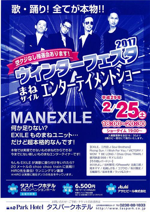 抽選会付きの楽しい”まねザイル”のエンターテイメントショー!! 2月25日(土)にタスパークホテルで開催されるものまねディナーショー『ウィンターフェスタ2017 まねザイル エンターテイメントショーのチケットをペアで1名様にプレゼント! 超本格的なEXILEものまねユニット まねザイルによる 楽しいショーとお料理、ドリンク飲み放題のチケットです。(6,500円×2枚) ご希望の方は、以下の要領でお申し込みください。 ※※ プレゼントの応募は締め切りました。たくさんのご応募ありがとうございました。 ※※ ■■■ 「まねザイル エンターテイメントショー」のチケットをペアで1名に ■■■ ●ウィンターフェスタ2017 まねザイルエンターテイメントショー 日 時 : 2017年2月25日(土) 18:00〜20:30(ショータイム19:00〜) 場 所 :タスパークホール 2階コンベンションホール ※お問合せ、チケットの購入は タスパークホテル(88−1833)まで <応募方法> おらんだラジオホームページのメッセージフォームまたはメールで以下の内容をご記入の上、 ご応募ください。 「まねザイル エンターテイメントショー」ペアチケット希望 ラジオネーム : お名前 : 連絡の取れるメールアドレスまたは、電話番号 : <応募条件> ・募集締め切り 2017年2月21日(火)ゆうらじ 終了まで ・おらんだラジオまで直接チケットを取りにきていただける方に限ります ※応募多数の場合には抽選となります ※当選者には、おらんだラジオ事務局よりご連絡致します ::::: エフエム い〜じゃん おらんだラジオ 77.7MHz :::::