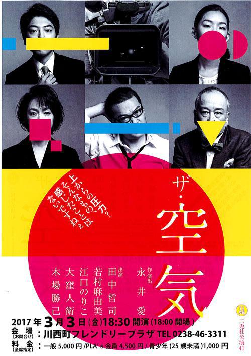 3月3日(金)に川西町フレンドリープラザで上演される「ザ・空気」のチケットをペアにして2組にプレゼントいたします。 テレビ局の報道現場を通して日本独特の「空気を読む」という現象を描く『ザ・空気』。永井愛 作・演出、田中哲司、若村麻由美ら、実力派のキャストの緊迫した舞台をご堪能ください。 今回は、川西町フレンドリープラザさんより「おらんだラジオのリスナーさんへ」とペアチケットを2組頂きました。(一般5,000円×2枚) ご希望の方は、以下の要領でお申し込みください。人気のため急遽追加公演も行われた話題の舞台をどうぞお楽しみください。 ※※ プレゼントの応募は締め切りました。たくさんのご応募ありがとうございました。 ※※ ■■■舞台 「ザ・空気」のチケットをペアで2組に ■■■ ● 舞台 「ザ・空気」 日時 : 2017年3月3日(金) 開場 18:00 開演 18:30 場所 : 川西町フレンドリープラザ( 川西町大字上小松1037番地1 )<応募方法> おらんだラジオホームページのメッセージフォームまたはメールで以下の内容をご記入の上、 ご応募ください。 「ザ・空気」チケット希望 ラジオネーム : お名前 : 連絡の取れるメールアドレスまたは、電話番号 : <応募条件> ・募集締め切り 2017年2月27日(月)ゆうらじ 終了まで ・おらんだラジオまで直接チケットを取りにきていただける方に限ります ※応募多数の場合には抽選となります ※当選者には、おらんだラジオ事務局よりご連絡致します ::::: エフエム い〜じゃん おらんだラジオ 77.7MHz :::::