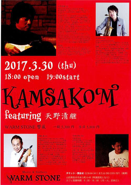木曜 19:30 から放送中の 『T's Music Lounge』 の横澤徹さんより、割引チケットのプレゼントです。 ジャズフュージョン界の名手たちが長井に集結!圧倒的なライブパフォーマンスと、テクニカルな演奏でファンを魅了する 『KAMSAKOM featuring 天野清継(カンサコン フィーチャリング あまのきよつぐ )』のライブが長井で楽しめるビックチャンス! メンバーには、山形出身の元T-SQUAREの須藤満さんも!! WORM STONE 響蔵(ウォームストーンひびきぐら) で開催されるライブの割引チケットをペアで1組にプレゼントいたします。一般5,300円のチケットを2,000円割引、ペアにして 1組に提供いたします。 ご希望の方は、次の要領でご応募ください。 ※※ プレゼントの応募は締め切りました。たくさんのご応募ありがとうございました。 ※※ ■■■ 「KAMSAKOM featuring 天野清継 ライブ」の割引チケットをペアで1組に ■■■ ●KAMSAKOM featuring 天野清継(カンサコン フィーチャリング あまのきよつぐ ) 日時 : 2017年3月30日(木) 開場 18:00 開演 19:00 場所 : WORM STONE 響蔵(ウォームストーンひびきぐら) <応募方法> おらんだラジオホームページのメッセージフォームまたはメールで 以下の内容をご記入の上、ご応募ください。 「KAMSAKOM featuring 天野清継」割引チケット希望 ラジオネーム : お名前 : 連絡の取れるメールアドレスまたは、電話番号 : <応募条件> ・募集締め切り 2017年3月24日(金)ゆうらじ 終了まで ・おらんだラジオまで直接チケットを取りにきていただける方に限ります ※応募多数の場合には抽選となります ※当選者には、おらんだラジオ事務局よりご連絡致します ::::: エフエム い〜じゃん おらんだラジオ 77.7MHz :::::