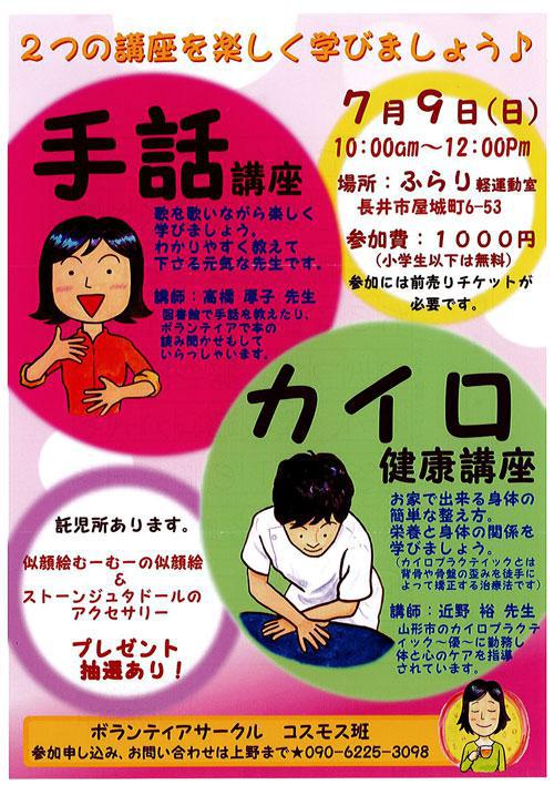 6/6(火)ひるらじ にもご出演頂いた ボランティアサークルコスモス班の上野さんより、「手話講座・カイロ健康講座」のチケット(1,000円×2枚)をプレゼント頂きました。 歌を歌いながらわかりやすく手話を学んでみませんか。お家で出来る体の整え方をカイロプラクティックの先生に学んでみませんか。 興味のある方は、以下の要領でご応募ください。 ※※ プレゼントの応募は締め切りました。たくさんのご応募ありがとうございました。 ※※ ■■■ 「手話講座・カイロ健康講座」をペアで1組に ■■■ ●手話講座・カイロ健康講座 日時 : 2017年7月9日(日) 午前10時 〜 正午 場所 : ふらり軽運動室(長井市屋代町6-53) <応募方法> おらんだラジオホームページのメッセージフォームまたは メールで以下の内容をご記入の上、ご応募ください。 「手話講座・カイロ健康講座」ペアチケット希望 ラジオネーム : お名前 : 連絡の取れるメールアドレスまたは、電話番号 : <応募条件> ・募集締め切り 2017年7月4日(火)ゆうらじ 終了まで ・おらんだラジオまで直接チケットを取りにきていただける方に限ります ※応募多数の場合には抽選となります ※当選者には、おらんだラジオ事務局よりご連絡致します ::::: エフエム い〜じゃん おらんだラジオ 77.7MHz :::::