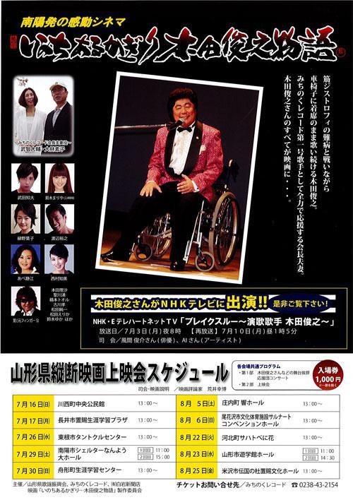 難病の筋ジストロフィと戦いながら、車椅子に着席のまま歌い続ける木田俊之の半生を描いた感動の映画の上映会が開催されます。 映画「いのちあるかぎり…木田俊之物語」制作委員会さんより、上映会のチケットと本とCDをプレゼントして頂きました。 ご希望の方は、以下の要領でご応募ください。 ※※ プレゼントの応募は締め切りました。たくさんのご応募ありがとうございました。 ※※ ●「いのちあるかぎり木田俊之物語」上映会チケットをペアで1組 日時 : 2017年7月17日(月) 開場12:30 開演13:00 場所 : 長井市置賜生涯学習プラザ(長井市九野本1235番地の1) ※プレゼントは、長井市での上映会のチケットです ●本 筋ジストロフィーの演歌歌手 木田俊之の半生「生きるチカラ」 1名様 ●CD 「いのちあるかぎり…木田俊之物語」サントラ盤 1名様 <応募方法> おらんだラジオホームページのメッセージフォームまたは メールで以下の内容をご記入の上、ご応募ください。 <希望のプレゼントを必ず明記ください> ●映画の上映会のチケット(2枚) ●本 ●CD ラジオネーム : お名前 : 連絡の取れるメールアドレスまたは、電話番号 : <応募条件> ・募集締め切り 2017年7月12日(水)ゆうらじ 終了まで ・おらんだラジオまで直接チケットを取りにきていただける方に限ります ※応募多数の場合には抽選となります ※当選者には、おらんだラジオ事務局よりご連絡致します ::::: エフエム い〜じゃん おらんだラジオ 77.7MHz :::::