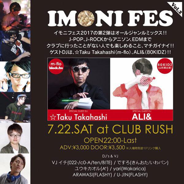 イモニフェス2017 第2弾は、オールジャンルミックス!!J-POP、J-ROCK から アニソン、EDMまで、クラブに行ったことがない人でも楽しめるイベントになっています。 ゲストDJは、☆Taku Takahashi(m-flo)と ALI&(80KIDZ)。 7/11(火)ゆうらじ にゲスト出演頂いた IMONI FES 実行委員会の三井さんより、ペアチケットを頂きました。 ご希望の方は以下の要領でご応募ください。 ※※ プレゼントの応募は締め切りました。たくさんのご応募ありがとうございました。 ※※ ■■■ 「IMONI FES 2017 Vol.2」をペアで1組に ■■■ ●IMONI FES 2017 Vol.2 日時 : 2017年7月22日(土) 開演 22:00 場所 : CLUB RUSH(山形市霞町1-15-16 B1F)<応募方法> おらんだラジオホームページのメッセージフォームまたは メールで以下の内容をご記入の上、ご応募ください。 「IMONI FES 2017 Vol.2 」チケット希望 ラジオネーム : お名前 : 連絡の取れるメールアドレスまたは、電話番号 : <応募条件> ・募集締め切り 2017年7月18日(火)ひるらじ 終了まで ・おらんだラジオまで直接チケットを取りにきていただける方に限ります ※応募多数の場合には抽選となります ※当選者には、おらんだラジオ事務局よりご連絡致します ::::: エフエム い〜じゃん おらんだラジオ 77.7MHz :::::