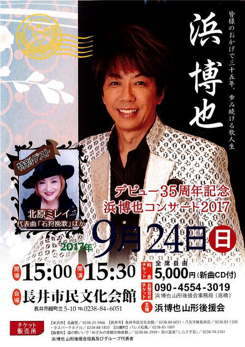 今年デビュー35周年を迎える 浜博也さんのコンサートチケットを10名にプレゼント!新曲CD付きのお得なチケットです。(CDは後からのお渡し) 端正なルックスと甘い歌声が人気の飯豊町出身の浜博也さん。デビュー35周年記念コンサートが、9月24日(日)に 長井市民文化会館で開催されます。特別ゲストは、石狩挽歌で有名な 北原ミレイさんです。 浜博也後援会事務局さんより、おらんだラジオのリスナーさんへと10名さま分のチケットをプレゼント頂きました。 ご希望の方は、次の要領でご応募ください。 ※※ プレゼントの応募は締め切りました。たくさんのご応募ありがとうございました。 ※※ ■■■ 「浜博也コンサート チケット」を10名さまにプレゼント ■■■ ●デビュー35周年 2017 浜博也コンサート 日時 : 2017年9月24日(日) 開場15:00 開演15:30 場所 : 長井市民文化会館(長井市館町北5-10) <応募方法> おらんだラジオホームページのメッセージフォームまたは メールで以下の内容をご記入の上、ご応募ください。 「浜博也コンサート」チケット希望 ラジオネーム : お名前 : 連絡の取れるメールアドレスまたは、電話番号 : <応募条件>・募集締め切り 2017年8月31日(木)ゆうらじ 終了まで・おらんだラジオまで直接チケットを取りにきていただける方に限ります※応募多数の場合には抽選となります※当選者には、おらんだラジオ事務局よりご連絡致します ::::: エフエム い〜じゃん おらんだラジオ 77.7MHz :::::