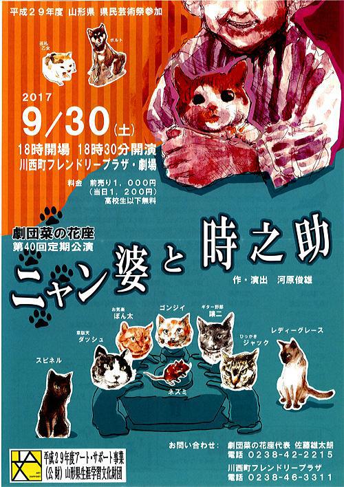 劇団菜の花座 第40回定期公演「ニャン婆と時の助」のチケットをペアにして3組にプレゼントいたします。 歌とダンスでネコのニャン生を生き生きと描く、元気が湧き出るステージです。ご希望の方は、以下の要領でご応募ください。 ※※ プレゼントの応募は締め切りました。たくさんのご応募ありがとうございました。 ※※ ■■■ 「ニャン婆と時の助」をペアで3組に ■■■ ●劇団菜の花座 第40回定期公演「ニャン婆と時の助」 日時 : 2017年9月30日(土) 開場 18:00 開演 18:30 場所 : 川西町フレンドリープラザ <応募方法> おらんだラジオホームページのメッセージフォームまたは メールで以下の内容をご記入の上、ご応募ください。 「ニャン婆と時の助」チケット希望 ラジオネーム : お名前 : 連絡の取れるメールアドレスまたは、電話番号 : <応募条件> ・募集締め切り 2017年9月26日(火)ゆうらじ 終了まで ・おらんだラジオまで直接チケットを取りにきていただける方に限ります ※応募多数の場合には抽選となります ※当選者には、おらんだラジオ事務局よりご連絡致します ::::: エフエム い〜じゃん おらんだラジオ 77.7MHz :::::