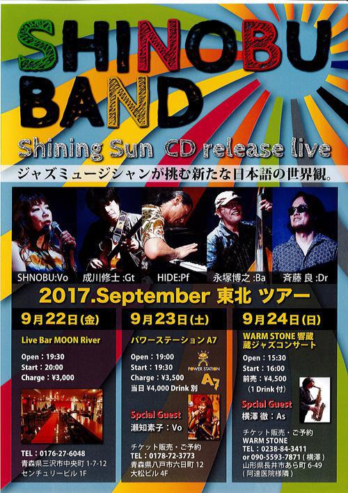 毎週木曜日放送の『T's Music Lounge』の横澤徹さんより、コンサートの割引ご招待のプレゼントです! 9月24日(日)に WORM STONE 響蔵(ウォームストーンひびきぐら)で開催される「SHINOBU BAND 蔵ジャズコンサート」を特別価格でご招待いたします。通常 一般 4,500円のチケットですが、2,000円割引の 2,500円で入場いただけます。 ご希望の方は、次の要領でご応募ください。 ※※ プレゼントの応募は締め切りました。たくさんのご応募ありがとうございました。 ※※ ■■■ 「SHINOBU BAND 蔵ジャズコンサート」の割引チケット ■■■ ●SHINOBU BAND 蔵ジャズコンサート 日時 : 2017年9月24日(土) 開場 15:30 開演 16:00 場所 : WARM STONE 響蔵(長井市あら町6-29) <応募方法>おらんだラジオホームページのメッセージフォームまたはメールで以下の内容をご記入の上、ご応募ください。 「SHINOBU BAND 蔵ジャズコンサート」割引チケット希望 ラジオネーム : お名前 : 連絡の取れるメールアドレスまたは、電話番号 : <応募条件>・募集締め切り 2017年9月21日(木)ゆうらじ 終了まで・おらんだラジオまで直接チケットを取りにきていただける方に限ります※応募多数の場合には抽選となります※当選者には、おらんだラジオ事務局よりご連絡致します ::::: エフエム い〜じゃん おらんだラジオ 77.7MHz :::::