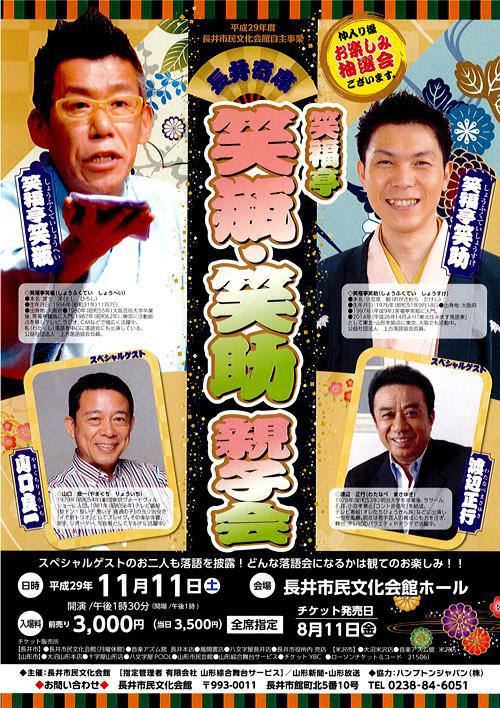 11月11日(土)に長井市民文化会館で開催される「長井寄席 笑福亭笑瓶・笑助 親子会」のチケットをペアにして3組にプレゼント! おらんだラジオ 木曜 ひるらじ のパーソナリティとしてもお馴染みの笑福亭笑助さんと、師匠の笑福亭笑瓶さんとの親子会が実現しました!! スペシャルゲスト の山口良一さんと渡部正行さんも落語に挑戦。楽しい愉快な落語会になること間違いなしです! こちらのチケットをご希望の方は、次の要領でご応募ください。 ※※ プレゼントの応募は締め切りました。たくさんのご応募ありがとうございました。 ※※ ■■■ 「笑福亭笑瓶・笑助 親子会」チケットをペアで3組に ■■■ ●長井寄席 笑福亭笑瓶・笑助 親子会 日時 : 2017年11月11日(土) 開場 午後1時 開演 午後1時30分 場所 : 長井市民文化会館ホール <応募方法> おらんだラジオホームページのメッセージフォームまたは メールで以下の内容をご記入の上、ご応募ください。 「笑瓶・笑助 親子会」チケット希望 ラジオネーム : お名前 : 連絡の取れるメールアドレスまたは、電話番号 : <応募条件>・募集締め切り 2017年11月7日(火)ゆうらじ 終了まで・おらんだラジオまで直接チケットを取りにきていただける方に限ります※応募多数の場合には抽選となります※当選者には、おらんだラジオ事務局よりご連絡致します ::::: エフエム い〜じゃん おらんだラジオ 77.7MHz :::::
