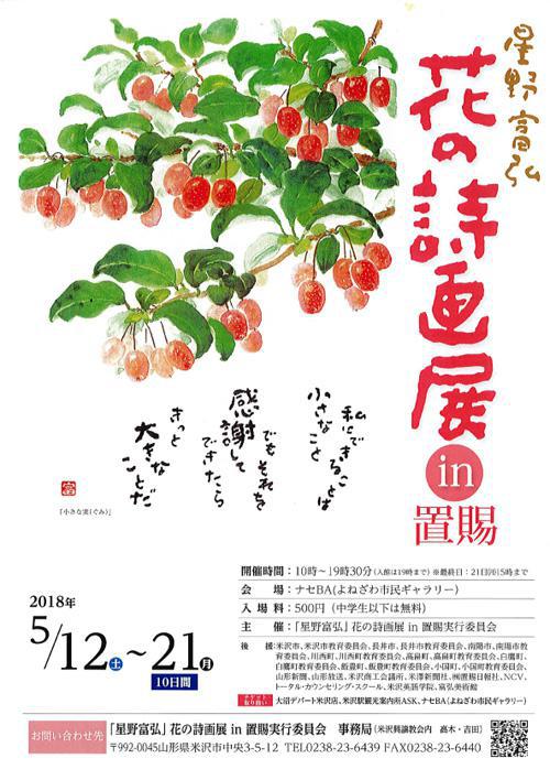 手足の自由を失いながら、筆を口でくわえて詩と水彩画を描く星野富弘さんの花の詩画展が米沢市で開催されます。 やさしさと愛に満ちた作品を実際にみてみませんか。ご希望の方は、次の要領でご応募ください。 ※※ プレゼントの応募は締め切りました。たくさんのご応募ありがとうございました。 ※※ ■■■ 「星野富弘 花の詩画展 in 置賜」チケットを5名に ■■■ ●星野富弘 花の詩画展 in 置賜 期間: 2018年5月12日(土)〜21日(月) 時間: 10時〜19時30分(入館は19時まで)※最終日は15時まで 場所: 米沢市民ギャラリー ナセBA(なせば) 米沢市中央3-5-12<応募方法>おらんだラジオホームページのメッセージフォームまたはメールで以下の内容をご記入の上、ご応募ください。 「星野富弘 花の詩画展 in 置賜」チケット希望 ラジオネーム : お名前 : 連絡の取れるメールアドレスまたは、電話番号 : <応募条件>・募集締め切り 2018年5月15日(火)ゆうらじ 終了まで・おらんだラジオまで直接チケットを取りにきていただける方に限ります※応募多数の場合には抽選となります※当選者には、おらんだラジオ事務局よりご連絡致します ::::: エフエム い〜じゃん おらんだラジオ 77.7MHz :::::