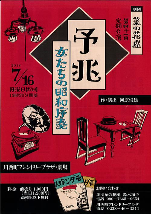 川西フレンドリープラザ劇場で開催される、劇団菜の花座の第41回定期公演「予兆 女たちの昭和序奏」のチケットをペアにして3組にプレゼントします。 菜の花座は、井上ひさし氏が校長を務めたフレンドリープラザ演劇学校の卒業生が中心となって旗揚げした劇団です。 チケットをご希望の方は、次の要領でご応募ください。 ※※ プレゼントの応募は締め切りました。たくさんのご応募ありがとうございました。 ※※ ■■■ 劇団菜の花座「予兆 女たちの昭和序奏」をペアで3組に ■■■ ●劇団菜の花座「予兆 女たちの昭和序奏」 日時 : 2018年7月16日(月・祝) 開演 13:30 場所 : 川西町フレンドリープラザ(東置賜郡大字上小松1037−1) <応募方法>おらんだラジオホームページのメッセージフォームまたはメールで以下の内容をご記入の上、ご応募ください。 「予兆」チケット希望ラジオネーム :お名前 :連絡の取れるメールアドレスまたは、電話番号 : <応募条件>・募集締め切り 2018年7月9日(月)ゆうらじ 終了まで・おらんだラジオまで直接チケットを取りにきていただける方に限ります※応募多数の場合には抽選となります※当選者には、おらんだラジオ事務局よりご連絡致します ::::: エフエム い〜じゃん おらんだラジオ 77.7MHz :::::