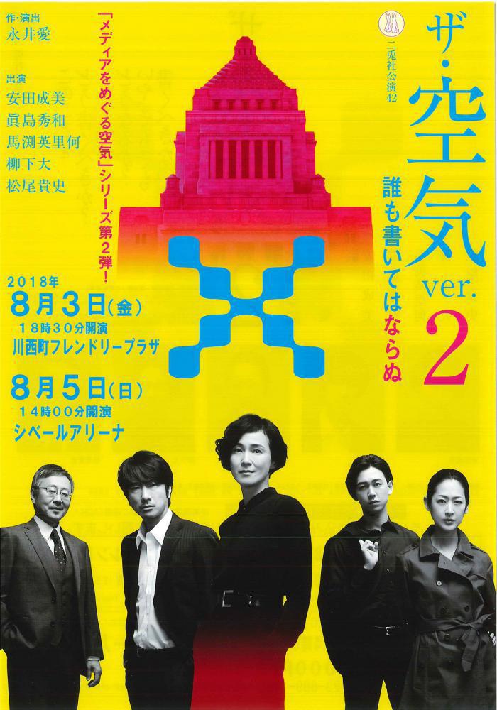 テレビ局の報道現場を通して、今の日本を覆う奇妙な”空気”というものの正体に迫った前作『ザ・空気』 をさらにバージョンアップさせた新作『ザ・空気 ver.2 誰も書いてはならぬ』のペアチケットを1組にプレゼント! 出演は、安田成美、眞島秀和(米沢出身)、馬渕英里何、柳下大、松尾貴史。話題の二兎社の新作舞台をぜひご鑑賞ください。 チケットをご希望の方は、次の要領でご応募ください。 ※※ プレゼントの応募は締め切りました。たくさんのご応募ありがとうございました。 ※※ ■■■ 「ザ・空気2」チケットをペアで1組に ■■■ ●ザ・空気2 誰も書いてはならぬ日時 : 2018年8月3日(金) 開場 18:00 開演 18:30場所 : 川西町フレンドリープラザ(川西町大字上小松1037番地1) <応募方法> おらんだラジオホームページのメッセージフォームまたは メールで以下の内容をご記入の上、ご応募ください。 「ザ・空気2」チケット希望ラジオネーム :お名前 :連絡の取れるメールアドレスまたは、電話番号 : <応募条件>・募集締め切り 2018年7月27日(金)ゆうらじ 終了まで・おらんだラジオまで直接チケットを取りにきていただける方に限ります※応募多数の場合には抽選となります※当選者には、おらんだラジオ事務局よりご連絡致します ::::: エフエム い〜じゃん おらんだラジオ 77.7MHz :::::