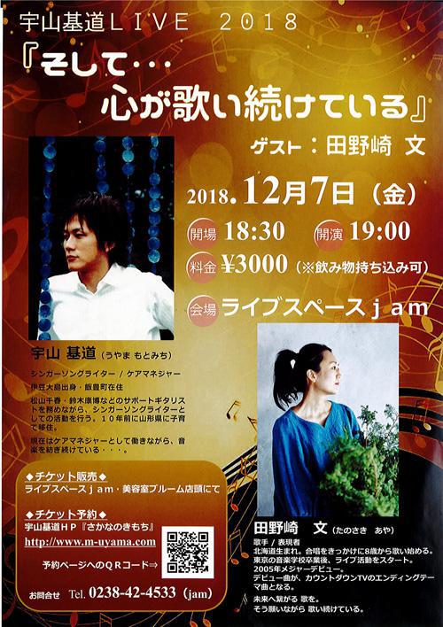 飯豊町在住のシンガーソングライター宇山基道(うやまもとみち)のライブ、『そして・・・心が歌い続けている』のチケットをペアにして1組にプレゼント! 松山千春(まつやまちはる)、鈴木康博(すずきやすひろ)などのサポートギタリストを務めながら、シンガーソングライターの活動を行い、子育てのために飯豊町に移住して10年。 優しい歌声とサービス精神あふれる 宇山基道さんの楽しいトークをぜひゆっくりとお楽しみください。 チケットをご希望の方は、次の要領でご応募ください。 ※※ プレゼントの応募は締め切りました。たくさんのご応募ありがとうございました。 ※※ ■■■ 「宇山基道ライブ」チケットをペアで1組に ■■■ ●宇山基道ライブ2018 そして・・・心が歌い続けている 日時 : 2018年12月7日(金) 開場 18:30 開演 19:00 場所 : ライブスペース jam(ジャム) 川西町大字上小松2992 <応募方法>おらんだラジオホームページのメッセージフォームまたはメールで以下の内容をご記入の上、ご応募ください。 「宇山基道ライブ」チケット希望ラジオネーム :お名前 :連絡の取れるメールアドレスまたは、電話番号 : <応募条件>・募集締め切り 2018年11月30日(金)ゆうらじ 終了まで・おらんだラジオまで直接チケットを取りにきていただける方に限ります※応募多数の場合には抽選となります※当選者には、おらんだラジオ事務局よりご連絡致します ::::: エフエム い〜じゃん おらんだラジオ 77.7MHz :::::