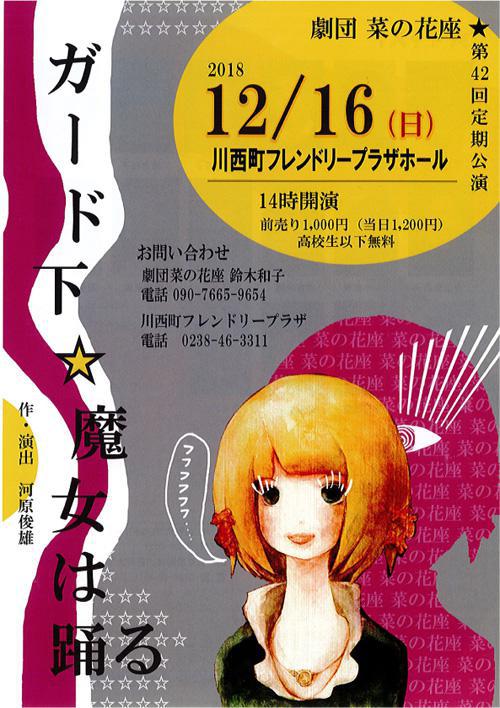劇団菜の花座の「ガード下☆魔女は踊る」のチケットをペアにして、1組にプレゼント!劇中歌を 木曜ひるらじパーソナリティの あべあいこちゃんが提供しています。 ” ガード下に流れる異質な時間。時を超える少女のせつない思いは、人々に明日をどう伝えるのだろう。 ” 川西町の劇団菜の花座さんの 意欲的な舞台をぜひどうぞ。チケットをご希望の方は、次の要領でご応募ください。 ■■■ 「ガード下☆魔女は踊る」チケットをペアで1組に ■■■ ●劇団菜の花座 第42回定期公演「ガード下☆魔女は踊る」 日時 : 2018年12月16日(日) 開演 14:00 場所 : 川西町フレンドリープラザ(川西町大字上小松1037番地1) ※※ プレゼントの応募は締め切りました。たくさんのご応募ありがとうございました。 ※※ <応募方法>おらんだラジオホームページのメッセージフォームまたはメールで以下の内容をご記入の上、ご応募ください。 「ガード下☆魔女は踊る」ペアチケット希望ラジオネーム :お名前 :連絡の取れるメールアドレスまたは、電話番号 : <応募条件>・募集締め切り 2018年12月10日(月)ゆうらじ 終了まで・おらんだラジオまで直接チケットを取りにきていただける方に限ります※応募多数の場合には抽選となります※当選者には、おらんだラジオ事務局よりご連絡致します ::::: エフエム い〜じゃん おらんだラジオ 77.7MHz :::::