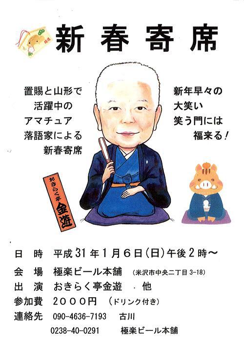 水曜ひるらじ パーソナリティとしてお馴染みの 古川さんこと、おきらく亭金遊さんが主催する「新春寄席」が開催されます。 置賜と山形で活躍中のアマチュア落語家による新春寄席です。新年早々の大笑い、笑う門には福来る! チケットをペアにして先着2組にプレゼントいたします。ご希望の方は、直接 おらんだラジオまでお越しください。 ※※ 終了ました。たくさんのご応募ありがとうございました。 ※※ ●新春寄席 日時 : 2019年1月6日(日) 午後2時〜 場所 : 極楽麦酒本舗(米沢市中央二丁目3-18) <引換条件> 「新春寄席」のチケットをご希望の方は、直接おらんだラジオまでお越しいただき、対応したスタッフに合言葉「新春寄席」とお伝えください。 おらんだラジオでチケット引換可能な日時は、平日の午前8時半から午後7時までとなります。 無くなり次第、プレゼント終了となります。締切りは、12月28日(金)ゆうらじ 終了までとなります。 ご希望の方は、急ぎ、タスビル3Fの おらんだラジオまで!! ::::: エフエム い〜じゃん おらんだラジオ 77.7MHz :::::