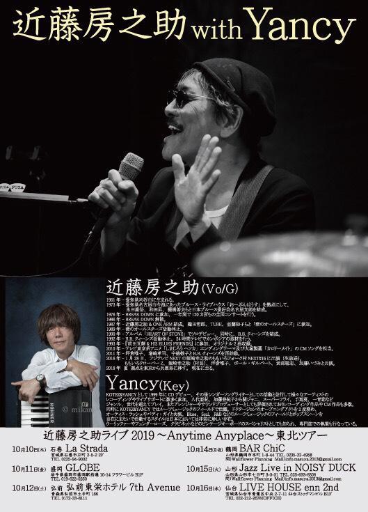 近藤房之介(こんどうふさのすけ)LIVE2019〜Anytime Anyplace〜東北ツアー山形公演のチケットをペアにして1組にプレゼントします。 「踊るポンポコリン」のBBクイーンズの怪しいオジサンとしても有名な日本を代表するブルースマン 近藤房之介の久しぶりの山形ライブです。 ●近藤房之助LIVE2019 〜Anytime Anyplace〜 東北ツアー 山形公演 場所:山形市七日町 Jazz Live in NOISY DUCK(ノイジーダック) 会場 19:00 開演 19:30 ※要別途ドリンク代500円をご負担ください 出演: 近藤房之助(G&Vo) with Yancy(ヤンシー) チケットをご希望の方は、次の要領でご応募ください。 ※※ プレゼントの応募は締め切りました。たくさんのご応募ありがとうございました。 ※※ <応募方法>おらんだラジオホームページのメッセージフォームまたはメールで以下の内容をご記入の上、ご応募ください。 「近藤房之介ライブ」チケット希望ラジオネーム :お名前 :連絡の取れるメールアドレスまたは、電話番号 : <応募条件>・募集締め切り 2019年10月8日(火)ゆうらじ 終了まで・おらんだラジオまで直接チケットを取りにきていただける方に限ります※応募多数の場合には抽選となります※当選者には、おらんだラジオ事務局よりご連絡致します ::::: エフエム い〜じゃん おらんだラジオ 77.7MHz :::::