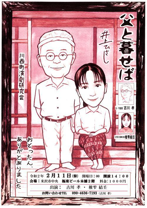 水曜 ひるらじ の人気パーソナリティ 古川孝さんが主演する演劇「父と暮らせば」のチケットを先着5名さまにプレゼントします。 「父と暮らせば」は、井上ひさし原作。原爆投下後の広島を舞台に被爆した父の亡霊と娘を描いた二人芝居です。ご希望の方は、次の要領でご応募ください。 ※※ プレゼントは終了しました。 ※※ ■■■ 「父と暮らせば」米沢公演 ■■■ ●父と暮らせば 日時 : 2020年2月11日(火・祝)開場 13:30 開演 14:00 場所 : 極楽ビール本舗(米沢市中央)<応募方法>「チケット」をご希望の方は、直接おらんだラジオまでお越しいただき、対応したスタッフに 合言葉「父と暮らせば」とお伝えください。 おらんだラジオでチケット引換可能な日時は、平日の午前8時半から午後7時までとなります。 無くなり次第、プレゼント終了となります。ご希望の方は、急ぎ、タスビル3Fの おらんだラジオまで!! ::::: エフエム い〜じゃん おらんだラジオ 77.7MHz :::::