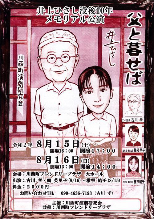 水曜 ひるらじ の人気パーソナリティ 古川孝さんが主演する演劇「父と暮らせば」のチケットを5名にプレゼントします。 「父と暮らせば」は、井上ひさし原作。原爆投下後の広島を舞台に被爆した父の亡霊と娘を描いた二人芝居です。 今回の公演は、井上ひさし没後10年のメモリアル公演です。ご希望の方は、次の要領でご応募ください。 ※※ プレゼントの応募は締め切りました。たくさんのご応募ありがとうございました。 ※※ ■■■ 「父と暮らせば」メモリアル公演 ■■■ ●父と暮らせば 日時 : 2020年8月15日(土)開場 16:00 開演 17:00 2020年8月16日(日)開場 13:00 開演 14:00 場所 : 川西町フレンドリープラザ 大ホール ※チケットは共通チケットになります。いずれかの公演でご利用いただけます。<応募方法>おらんだラジオホームページのメッセージフォームまたはメールで以下の内容をご記入の上、ご応募ください。 「父と暮らせば」チケット希望ラジオネーム :お名前 :連絡の取れるメールアドレスまたは、電話番号 : <応募条件>・募集締め切り 2020年8月11日(火)ゆうらじ 終了まで・おらんだラジオまで直接チケットを取りにきていただける方に限ります※応募多数の場合には抽選となります※当選者には、おらんだラジオ事務局よりご連絡致します ::::: エフエム い〜じゃん おらんだラジオ 77.7MHz :::::