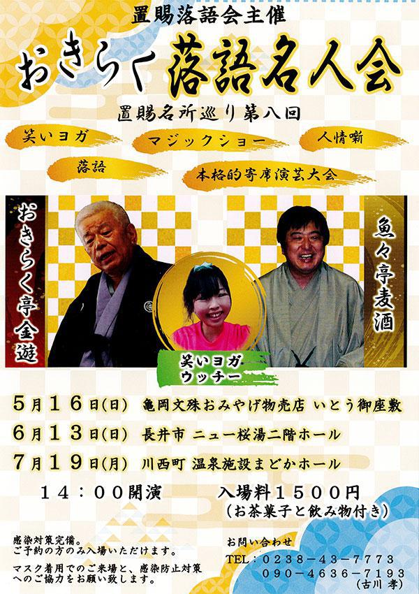 水曜ひるらじ パーソナリティの古川孝さんが主宰する「おきらく落語名人会」のチケットをペアにして3名様にプレゼントします! 笑いヨガ、マジックショー、人情噺、落語など、バラエティ豊かな本格的寄席演芸大会。お茶菓子と飲み物付きです。 たまには思いっきり笑って気分転換はいかがですか?チケットをご希望の方は、次の要領でご応募ください。 ※※ プレゼントの応募は締め切りました。たくさんのご応募ありがとうございました。 ※※ ●おきらく落語名人会 日時 : 2021年7月19日(月) 開演 14:00 場所 : 川西町 温泉施設まどかホール ※マスク着用でのご来場と、感染防止対策へのご協力をお願いします。 <応募方法>おらんだラジオホームページのメッセージフォームまたはメールで以下の内容をご記入の上、ご応募ください。 「おきらく落語名人会」チケット希望ラジオネーム :お名前 :連絡の取れるメールアドレスまたは、電話番号 : <応募条件>・募集締め切り 2021年7月12日(月)ゆうらじ 終了まで・おらんだラジオまで直接チケットを取りにきていただける方に限ります※応募多数の場合には抽選となります※当選者には、おらんだラジオ事務局よりご連絡致します ::::: エフエム い〜じゃん おらんだラジオ 77.7MHz :::::