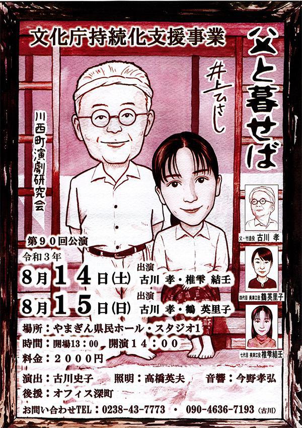 水曜ひるらじ パーソナリティ 古川孝さんの主演する井上ひさし原作の舞台『父と暮らせば』のチケットを10名さまにプレゼント! 原爆投下後の広島を舞台に、生き残った負い目を抱える娘と、彼女の前に幽霊となって現れた父の交流を描いた人間ドラマです。 ●父と暮らせば 第90回公演 公演日:8月14日(土) 開場 13:00 開園 14:00 会場 :やまぎん現民ホール スタジオ1 出演 :古川 孝(ふるかわ たかし)、椎雫結壬(つちだ ゆみ) ご希望の方は、次の要領でご応募ください。 <応募方法>おらんだラジオホームページのメッセージフォームまたはメールで以下の内容をご記入の上、ご応募ください。 「父と暮らせば 8/14」チケット希望ラジオネーム :お名前 :連絡の取れるメールアドレスまたは、電話番号 : <応募条件>・募集締め切り 2021年8月10日(火)ゆうらじ 終了まで・おらんだラジオまで直接チケットを取りにきていただける方に限ります・プレゼントは、8/14(土)の公演チケットになります※応募多数の場合には抽選となります※当選者には、おらんだラジオ事務局よりご連絡致します ::::: エフエム い〜じゃん おらんだラジオ 77.7MHz :::::