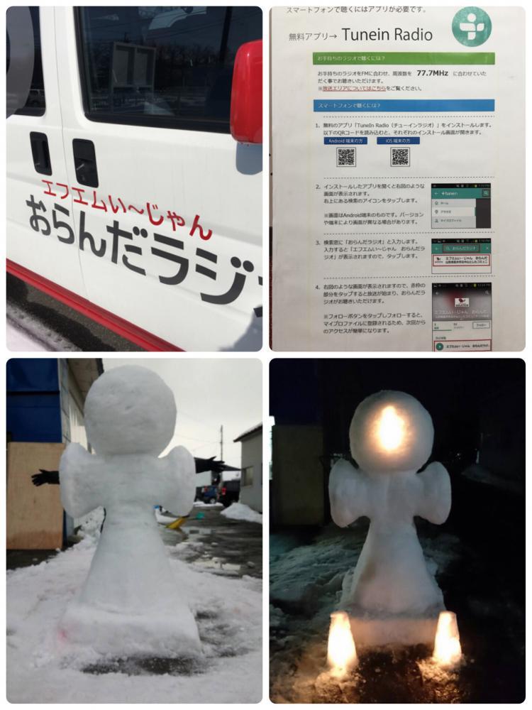 本日もお聞きいただき、ありがとうございます。今日のメッセージテーマは、『もっと上手になりたい事』です。お稽古事でも、趣味の事でも、いろんな事をゆうらじへもメッセージお願いします。明後日14日は、バレンタインデーですが!!けん玉でギネス記録に挑戦の日です。挑戦される皆さんに頑張っていただきたいですね(≧∇≦)写真は、下2枚は、けん玉広場SPIKEの前です。雪で作った雪けん玉です。上左は、ラジオカーです♪長井市周辺でお見かけの際は、よろしくお願いします??上右は、スマートフォンでおらんだラジオを聞く時に必要なアプリケーションソフトになります。