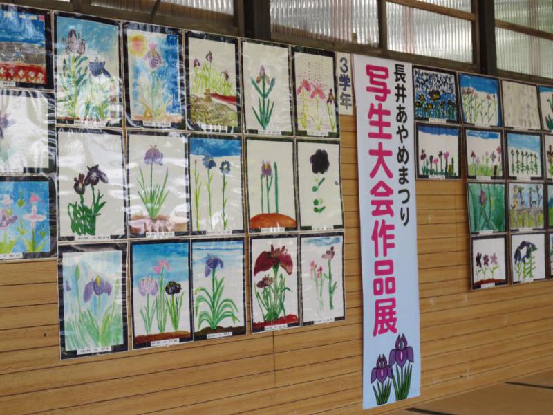 あやめまつり開催中のあやめ公園。 今日は、フラワー都市交流連絡協議会総会で長井市を訪れているみなさんや バスでの観光ツアーの方々で賑わっていましたよ。 さて、18日(日)に行われた「あやめ写生大会」。その作品があやめ公園に展示されています。 表彰式は今週末に行われます。 どれも心のこもったやさしい作品です。子どもたちの力作をぜひご覧くださいね。