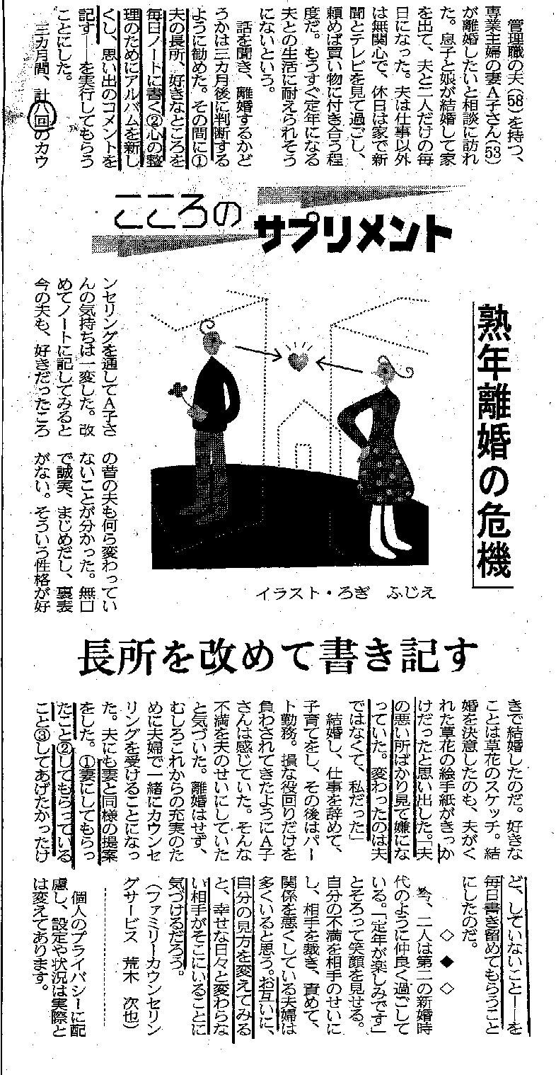 「心のサプリメント」という日経新聞のカウンセリングの定期版に「熟年離婚の危機」と題して別添のような記事が載っていました