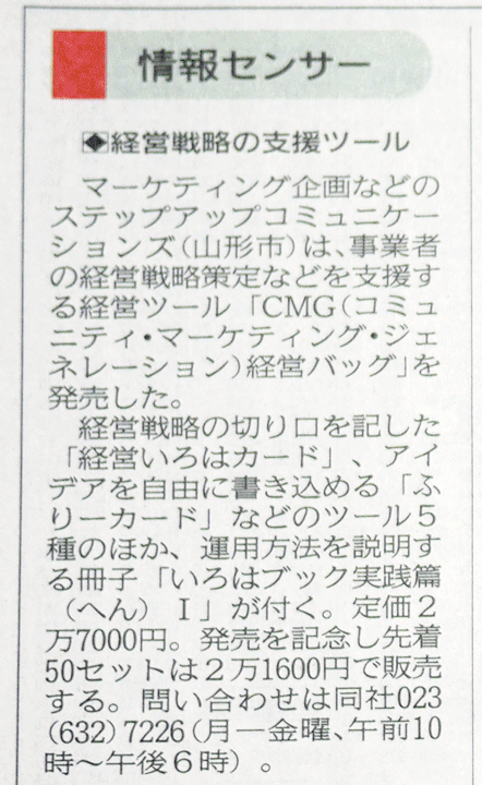 山形新聞・経済欄の「情報センサー」にて、ステップアップコミュニケーションズの新・経営ツール「CMG(シーエムジー)」を取り上げて戴きました。2014年11月8日(土)付の山形新聞経済欄にて。