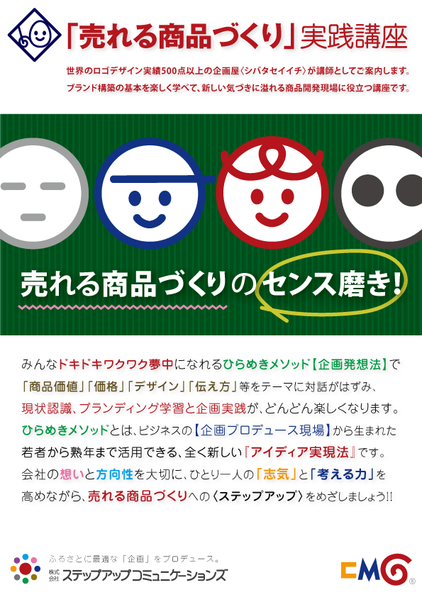 売れる商品づくりの基本を学びましょう。社内に「売れる商品づくり」のためのリーダーたちを育てましょう。世界のロゴデザイン実績500点以上の企画屋〈シバタセイイチ〉が講師としてご案内します。ブランド構築の基本を楽しく学べて、新しい気づきに溢れる「商品開発現場」に役立つ講座です。 詳細→「売れる商品づくり」実践講座フライヤー(PDF)