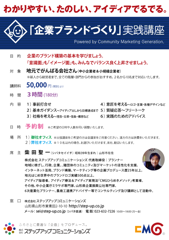 企業のブランド構築の基本を学びましょう。「意識面」も「イメージ面」も、みんなでバランス良く上昇させましょう。世界のロゴデザイン実績500点以上の企画屋〈シバタセイイチ〉が講師としてご案内します。ブランド構築の基本を楽しく学べて、理念を大切にして構築する「社格づくり」に役立つ講座です。 詳細→「企業ブランドづくり」実践講座フライヤー(PDF)