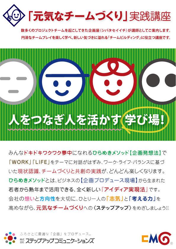 元気なチームづくりの基本を学びましょう。社内に「元気なチームづくり」のためのリーダーたちを育てましょう。数多くのプロジェクトチームを起こしてきた企画屋〈シバタセイイチ〉が講師としてご案内します。円滑なチームプレイを楽しく学べ、新しい気づきに溢れる「チームビルディング」に役立つ講座です。 詳細→「元気なチームづくり」実践講座フライヤー(PDF)