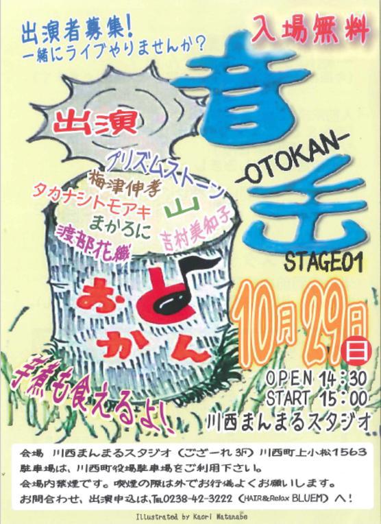 【まんまるスタジオライブ情報】・・・音缶・・おとかん・・ 楽しいライブだよ(^_-)-☆”音缶”ってなんだ!!地域で演奏活動を続けているミュージシャンによるライブステージが開催されます。...まんまるスタジオ・・巷で評判のミニスタジオです。季節の「いも煮」に舌鼓を打ちながら、ハートフルな楽曲の数々を是非ご堪能ください。【日時】10月29日(日)15:00スタート【会場】川西まんまるスタジオ(サロンdeござ〜れ3F) (川西町上小松1563・羽前小松駅前通り)【入場無料】【駐車場】川西町役場駐車場をご利用ください。※出演者募集中 出演申し込みは、TEL0238-42-3222 (HAIR&relaxBLUEMまで)